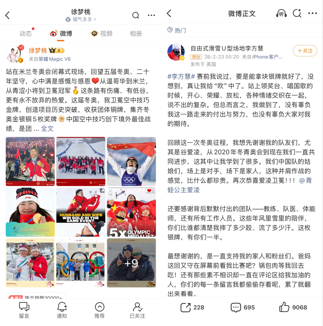 徐梦桃一直在分享训练日常、比赛感悟,李方慧也在赛后发文并感慨与谷爱凌之间的惺惺相惜,林孝埈、陈梦、孙颖莎等运动员,也均在持续更新内容。